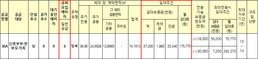 – 신혼부부ㆍ한부모가족 계층의 경우 혼인 중일 것, 공급신청자의 혼인기간 7년 이내, 자녀의 나이가 6세이하, 주택청약종합저축 가입