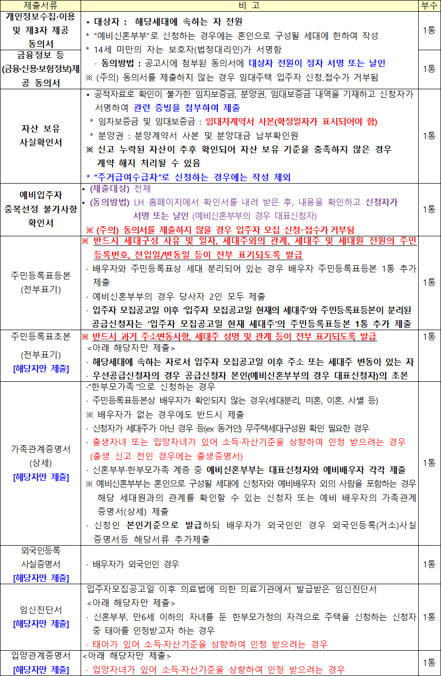 ※ 예비신혼부부의 경우 공급신청시 배우자 등 ‘혼인으로 구성될 세대’의 가구원 명단 (세대주와의 관계 포함)을 제출하여야 하며 입주 전까지 혼인으로 구성된 세대를 확인하기 위한 혼인관계증명서, 가족관계증명서, 주민등록표 (대표신청자와 예비배우자가 동일 등본에 있지 않은 경우는 각각 제출)를 제출하지 않을 경우와 입주자모집 시 신청한 예비신혼부부 당사자와 추후 입주하기 위해 제출한 혼인관계증명서상의 부부 및 가구원 명단이 일치하지 않는 경우에 별도의 통지 없