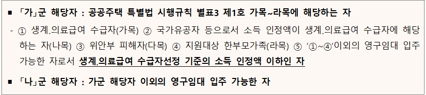 ② 나목 (국가유공자등), 마목 (북한이탈주민), 바목 (1순위 장애인), 아목 (아동복지시설퇴소자) : 월평균 소득 70%이하