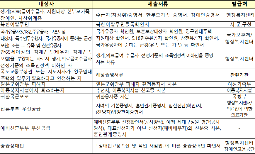 | 순위기준 | 1순위 : 생계ㆍ의료수급자, 유공자, 위안부 피해자, 한부모가족, 북한이탈주민, 장애인, 65세 이상 부양, 아동복지시설퇴소자, 65세 이상 2순위 : 일반, 국토교통부장관 또는 시도지사 선정, 장애인 |