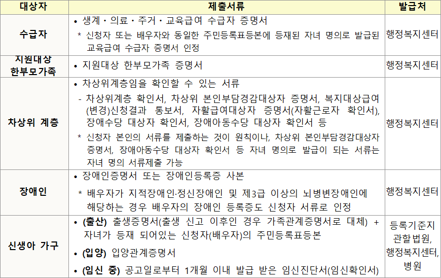 ※ 수급자, 지원대상 한부모가족 (한부모가족 증명서), 차상위계층은 금융정보 등 제공 동의서, 자산 보유사실 확인서 제출 불필요 (예비 신혼부부는 제출해야 함)